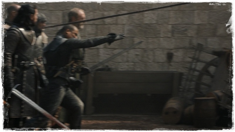 거침없는 하운드와 아리아의 언사에 당황하는 병사.