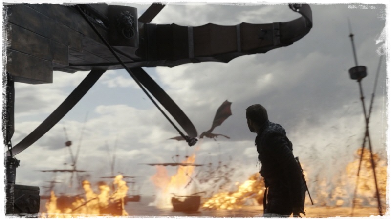 순식간에 내려와 배들을 불태우기 시작하는 대너리스와 드로곤.
