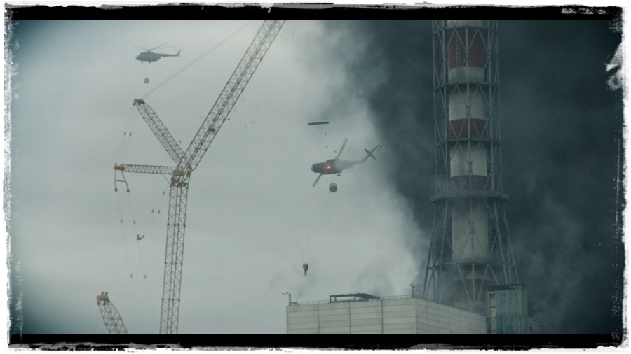 다시 날이 밝고 헬기를 이용한 살포작전이 시작됩니다. 보리스도 유능하네요. 하룻밤 사이에 어마어마한 양의 붕소와 모래를 잘도 구해왔습니다. 근거리에서 작전을 지켜보며 지시하는 보리스와 레가조프.