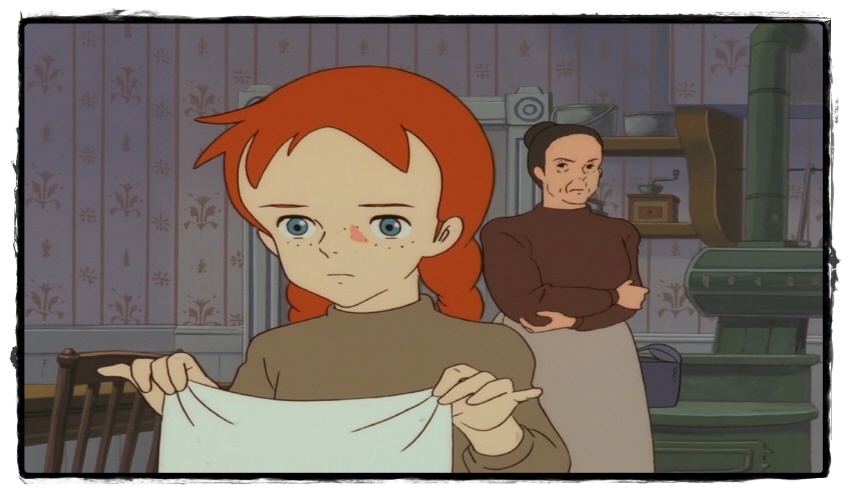 혹독한 교육을 하기로 마음먹은 마릴라는 아무 말 없이 앤을 지켜봅니다.