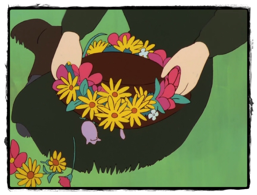 화려한 꽃을 꺾어 모자를 장식한 앤.