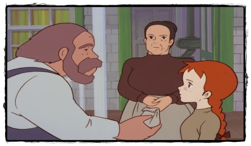 매튜 아저씨는 마차에서 내려 앤에게 무언가를 건네줍니다.