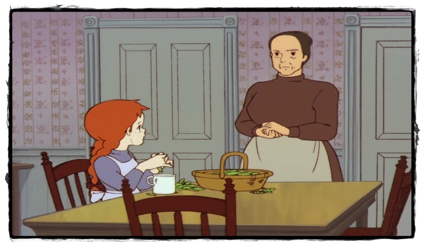 잠시 외출하는 마릴라. 식탁 위의 물건을 2층에 올려 두라고 앤에게 말합니다.