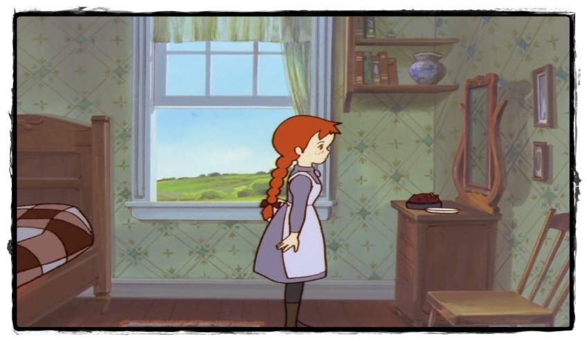 다음날 아침. 2층 방에 갇혀 근신을 하고 있으면서도 소풍에 대한 생각으로 아직 표정이 밝은 앤.
