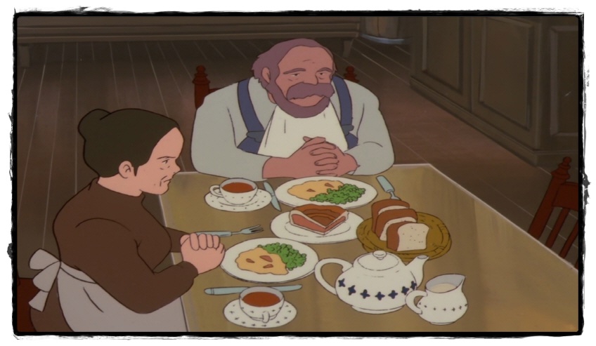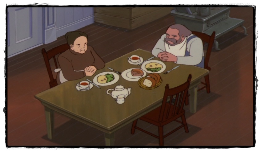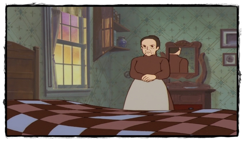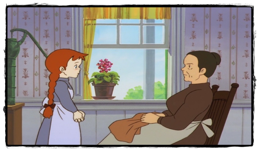 잠시 외출하는 마릴라. 식탁 위의 물건을 2층에 올려 두라고 앤에게 말합니다.