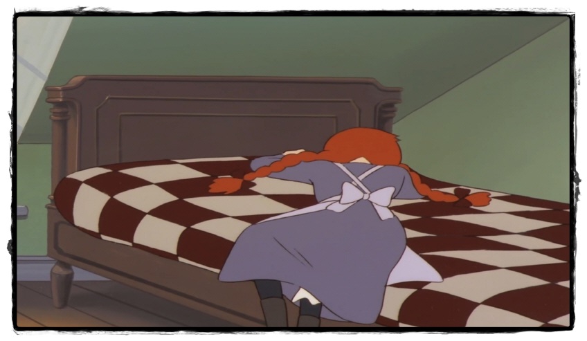앤은 대성통곡을 하며 손으로 침대를 여러 번 내려칩니다. 딱 봐도 앤은 브로치를 가져가지 않은 것이 분명합니다. 소풍을 가기 위해서 거짓자백은 한 것이 틀림없네요. 그럼에도 불구하고 소풍을 가지 못하게 되었으니 완전히 멘붕이 온 거죠. ㅉㅉ